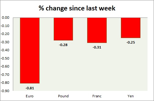 Strength meter (since last week) – Euro -0.81%, Franc -0.31%, Yen -0.25%, GBP -0.28%