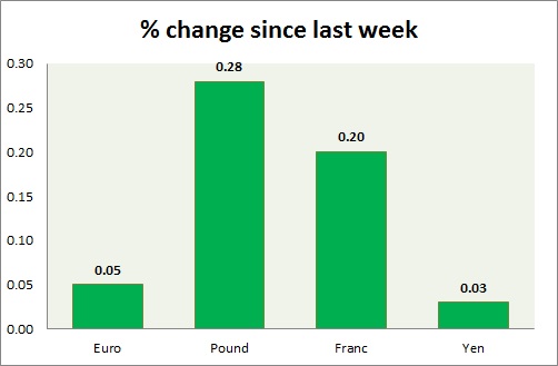 Strength meter (since last week) – Euro +0.05%, Franc +0.20%, Yen +0.03%, GBP +0.28%
