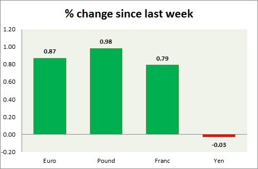 Strength meter (since last week) – Euro +0.87%, Franc +0.79%, Yen -0.03%, GBP +0.98%