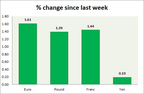 Strength meter (since last week) – Euro +1.61%, Franc +1.44%, Yen -0.19%, GBP +1.39%