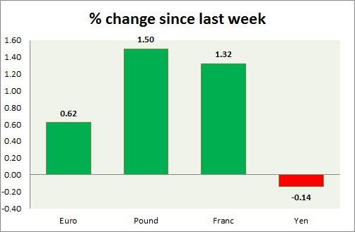 Strength meter (since last week) – Euro +0.62%, Franc +1.32%, Yen -0.14%, GBP +1.50%