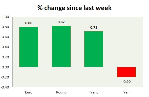 Strength meter (since last week) – Euro +0.80%, Franc +0.71%, Yen -0.20%, GBP +0.82%
