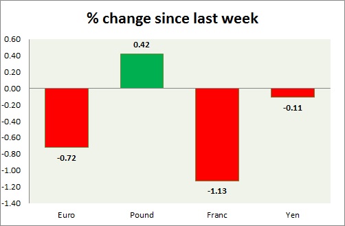 Strength meter (since last week) – Euro -0.72%, Franc -1.13%, Yen -0.11%, GBP +0.42%