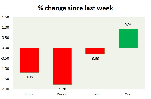 Strength meter (since last week) – Euro -1.19%, Franc -0.30%, Yen +0.94%, GBP -1.78%