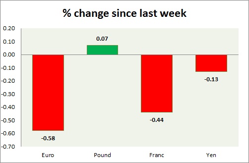 Strength meter (since last week) – Euro -0.58%, Franc -0.44%, Yen -0.13%, GBP -0.43%