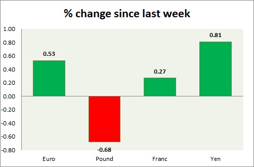 Strength meter (since last week) – Euro +0.53%, Franc +0.27%, Yen +0.81%, GBP -0.68%