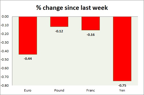 Strength meter (since last week) – Euro -0.44%, Franc -0.16%, Yen -0.75%, GBP -0.12%