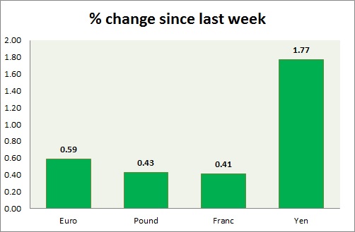 Strength meter (since last week) – Euro +0.59%, Franc +0.41%, Yen +1.77%, GBP +0.43%