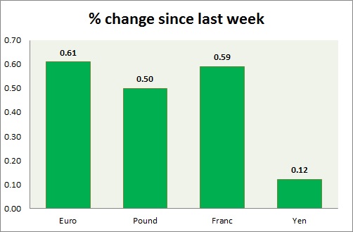 Strength meter (since last week) – Euro +0.61%, Franc +0.59%, Yen +0.12%, GBP +0.50%
