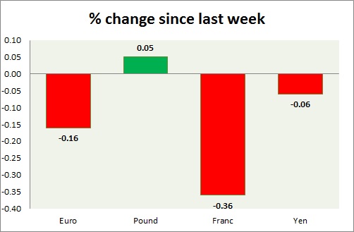 Strength meter (since last week) – Euro -0.16%, Franc -0.36%, Yen -0.06%, GBP +0.05%