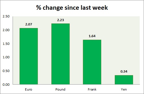 Strength meter (since last week) - Euro +2.07%, Franc +1.64%, Yen +0.34%, GBP +2.23%