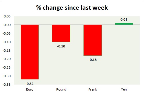 Strength meter (since last week) - Euro -0.32%, Franc -0.18%, Yen +0.01%, GBP -0.10%