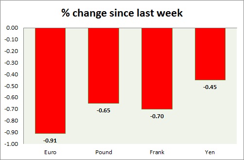 Strength meter (since last week) - Euro -0.91%, Franc -0.70%, Yen -0.45%%, GBP -0.65%