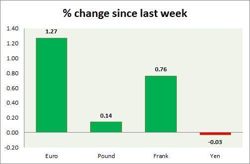 Strength meter (since last week) - Euro +1.27%, Franc +0.76%, Yen -0.03%%, GBP +0.14%
