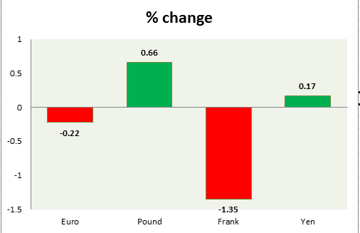 Dollar performance mixed against the majors (EUR, GBP, JPY, & CHF) so far this week. A chart and table is attached for explanation.