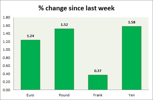 Strength meter (since last week) - Euro +1.24%, Franc +0.37%, Yen +1.58%, GBP +1.52%