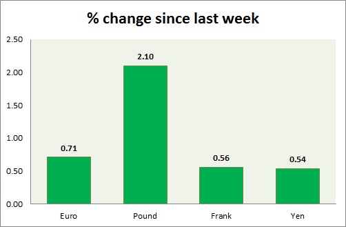 Strength meter (since last week) - Euro +0.71%, Franc +0.56%, Yen +0.54%, GBP +2.10%