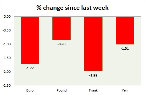 Strength meter (since last week) - Euro -1.72%, Franc -1.98%, Yen -1.01%, GBP -0.85%