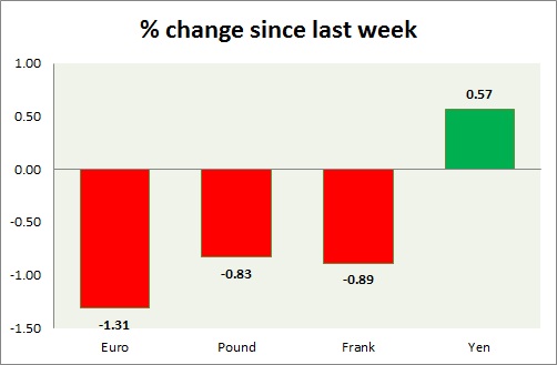 Strength meter (since last week) - Euro -1.31%, Franc -0.89%, Yen +0.57%, GBP -0.83%
