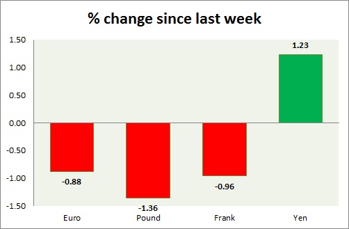 Strength meter (since last week) - Euro -0.46%, Franc -0.96%, Yen +1.23%, GBP -1.36%