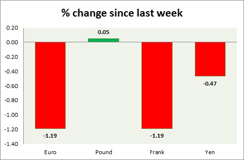 Strength meter (since last week) - Euro -1.19%, Franc -1.19%, Yen -0.47%, GBP +0.05%