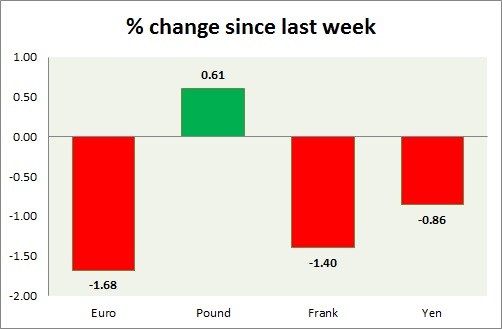 Strength meter (since last week) - Euro -1.68%, Franc -1.40%, Yen -0.86%, GBP +0.61%