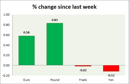 Strength meter (since last week) - Euro +0.58%, Franc -0.02%, Yen -0.12%, GBP +0.83%