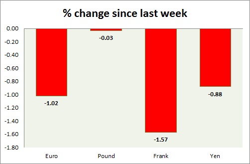 Strength meter (since last week) - Euro -1.02%, Franc -1.57%, Yen -0.88%, GBP -0.03%