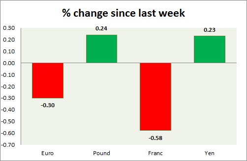 Strength meter (since last week) – Euro -0.30%, Franc -0.58%, Yen +0.23%, GBP +0.24%
