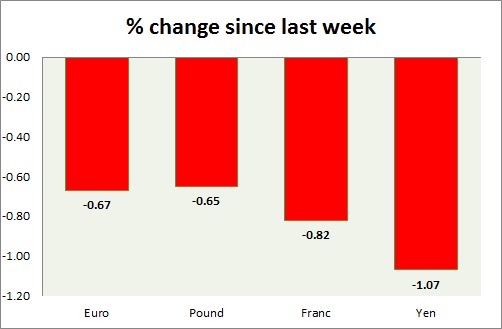 Strength meter (since last week) – Euro -0.67%, Franc -0.82%, Yen -1.07%, GBP -0.65%
