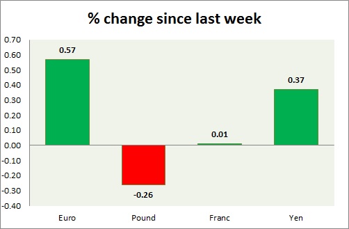 Strength meter (since last week) – Euro +0.57%, Franc +0.01%, Yen +0.37%, GBP -0.26%