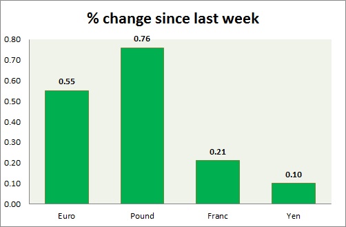 Strength meter (since last week) – Euro +0.55%, Franc +0.21%, Yen +0.10%, GBP +0.76%