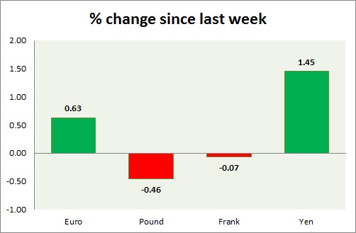 Strength meter (since last week) - Euro +0.63%, Franc -0.07%, Yen +1.45%, GBP -0.46%