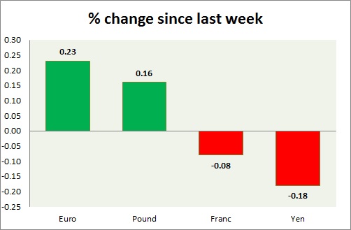 Strength meter (since last week) – Euro +0.23%, Franc -0.08%, Yen -0.18%, GBP +0.16%