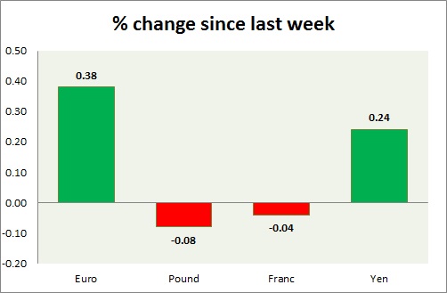 Strength meter (since last week) – Euro +0.38%, Franc -0.04%, Yen +0.24%, GBP -0.08%