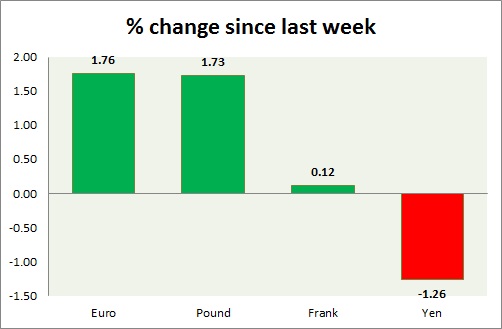 Strength meter (since last week) - Euro +1.76%, Franc -0.12%, Yen -1.26%, GBP +1.73%