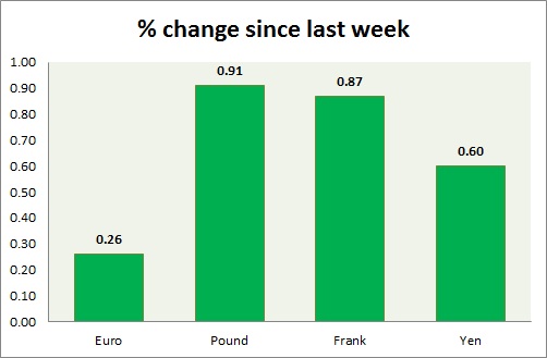 Strength meter (since last week) - Euro +0.26%, Franc +0.87%, Yen +0.60%, GBP +0.91%