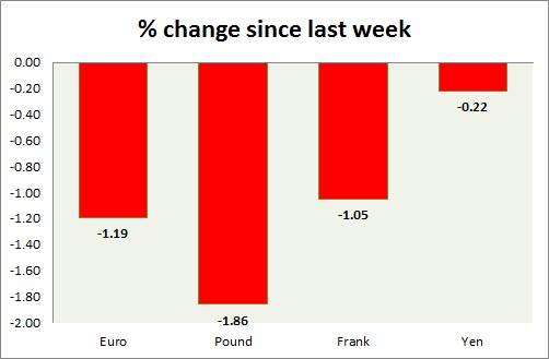 Strength meter (since last week) - Euro -1.19%, Franc -1.05%, Yen -0.22%, GBP -1.86%