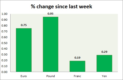 Strength meter (since last week) – Euro +0.75%, Franc +0.19%, Yen +0.29%, GBP +0.95%