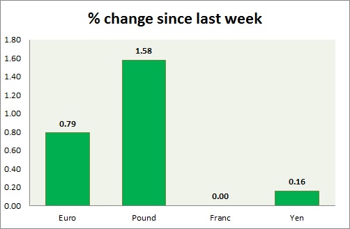 Strength meter (since last week) – Euro +0.79%, Franc +0.00%, Yen +0.16%, GBP +1.58%