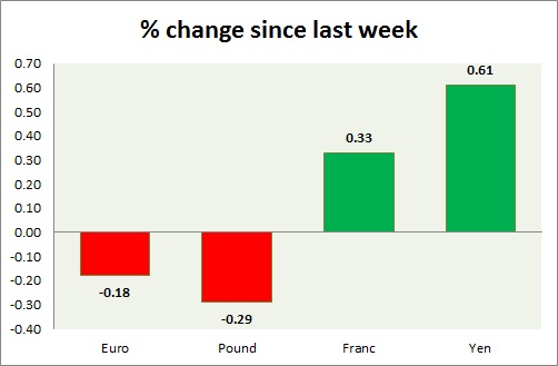 Strength meter (since last week) - Euro +0.34%, Franc +0.75%, Yen +0.48%, GBP -0.13%