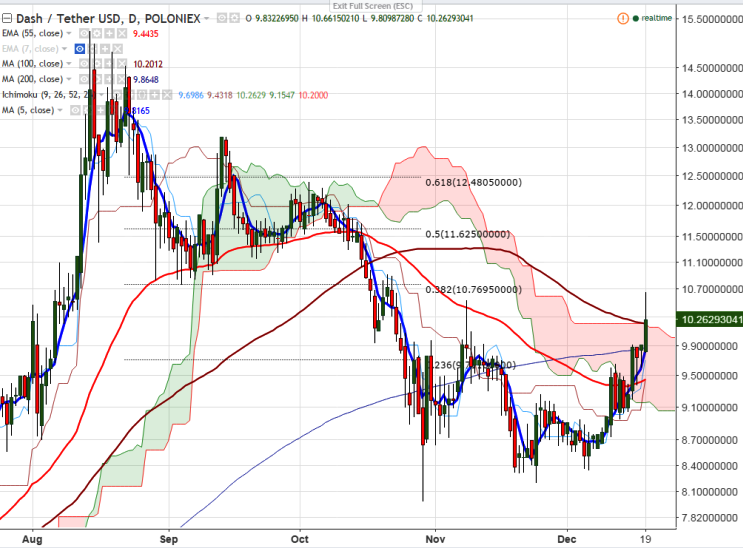 DASH/USDT is seen trading above on Monday. The pair has broken major resistance at USDT9.85 (200- day MA) and jumped sharply till USDT10.66 levels (Poloniex). It is currently trading around USDT10.16 at the time of writing.