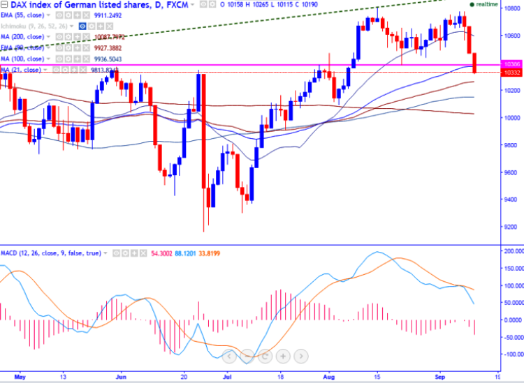 - DAX30 is trading weak for past three trading session .The index is trading near 55- day EMA and any break below confirms minor trend reversal, a decline till 10030 (200- day MA) possible.