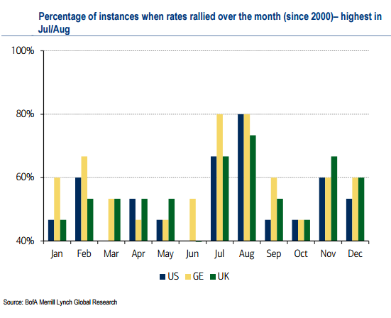 1) Bond yields are 20-25% more likely to rally in July and August than any other month in all three countries.
