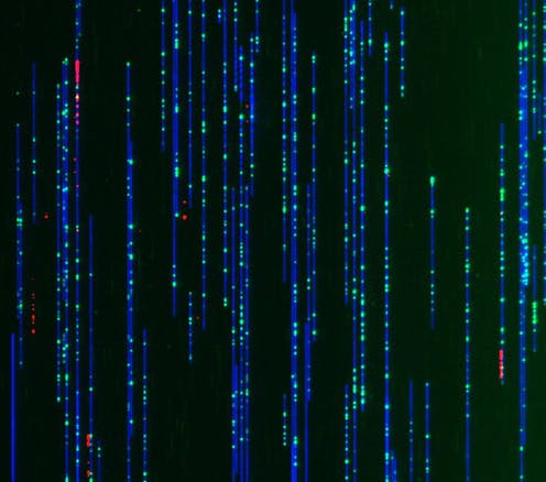 This image, taken with a device called the Bionano Genomics Saphyr imager, features individual DNA molecules – colored in blue, green and red. These strands of DNA have been aligned by threading them through narrow tubes – called nanochannels – that fit only one piece of DNA. As the DNA slips into the tube, the strands straighten.