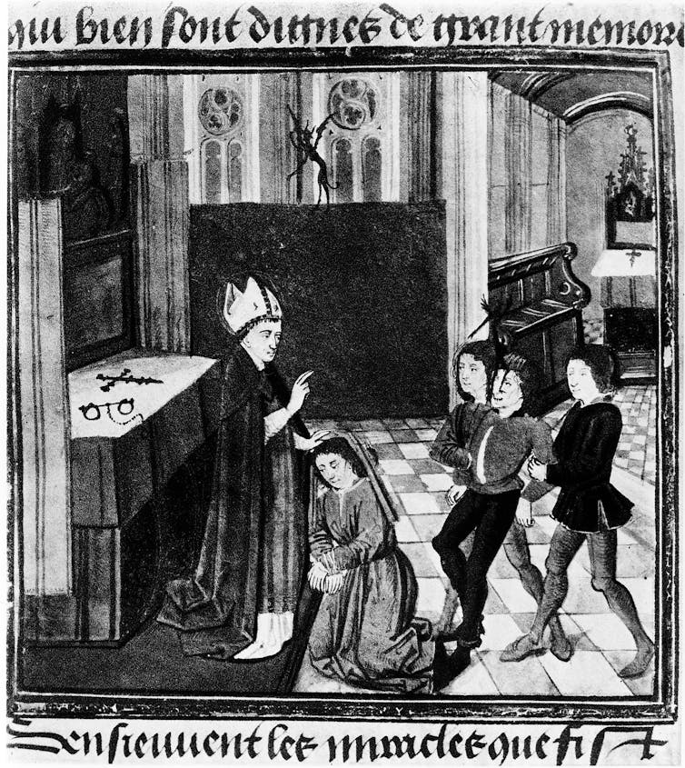 A bishop exorcising men possessed of evil spirits, France, 15th century. Wellcome Collection, CC BY