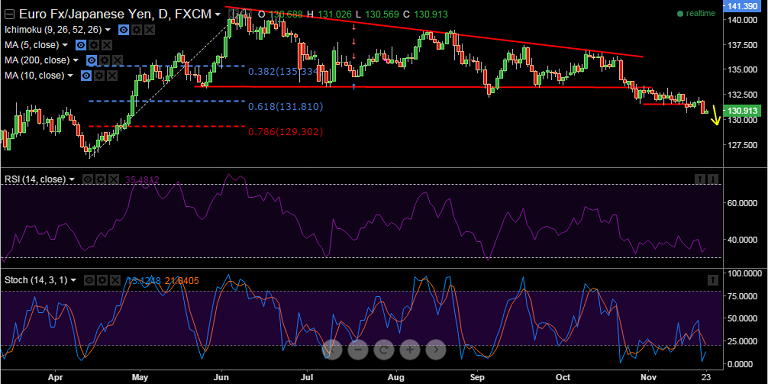 - EUR/JPY has hit lows of 130.56 during the day and has recovered slightly to currently trade at 130.92. Deeper losses likely in the days ahead.