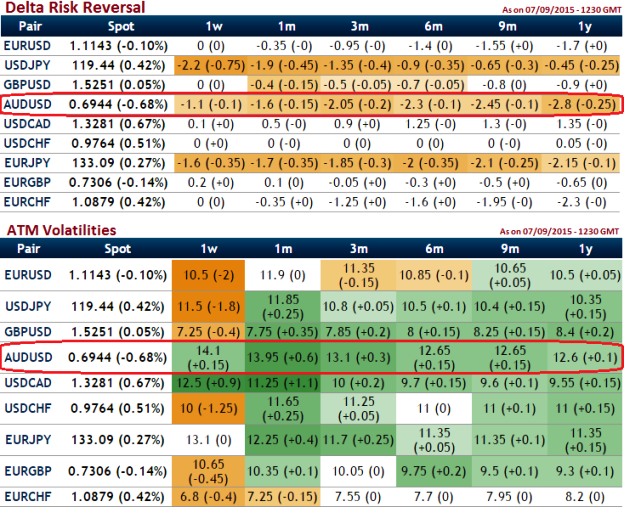 From the nutshells, for the next 1 year time frame, delta risk reversal is getting closer to -2 to -2.55. It is understood that ATM vols and 25-delta risk reversals of AUDUSD the most expensive pair to be hedged for downside risks as it indicates puts have been over priced (downside protection is relatively more expensive).