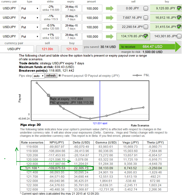 Delta advantage: As shown in the figure it is observed that the this strategy offers positive delta (22,305.73) at prevailing exchange rate which means we are long on USDJPY in underlying market. So, we are participating in dollar as long as it holds its strength but when JPY gains appreciation delta turns into negative (-3,078.08) which means we are also participating on downswings as well.