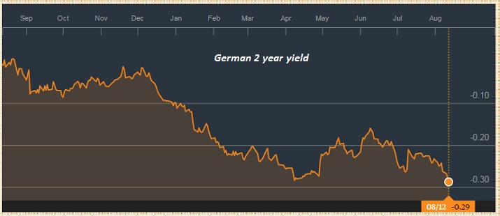 German 2 year bond yields tumbled to new record low today at -0.29% yield. Investors chose to forgo some of the cash in return for safety.